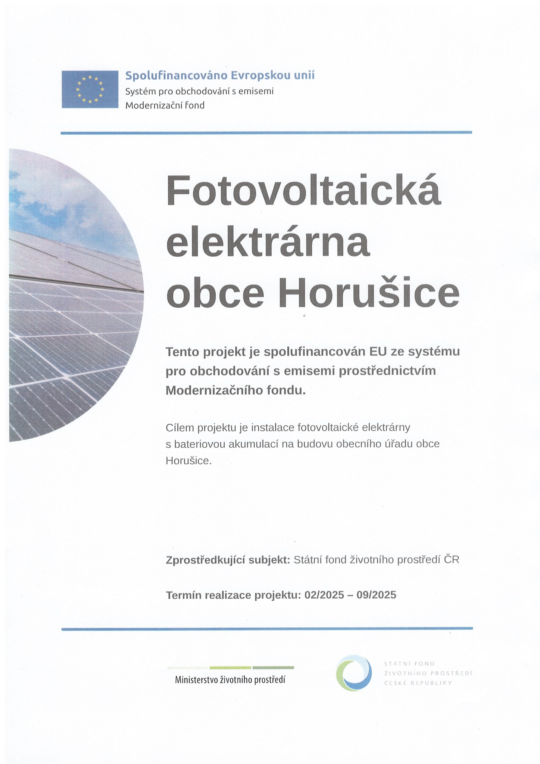 Projekt “ Fotovoltaická elektrárna obce Horušice“ byl spolufinancovám Evropskou unií.